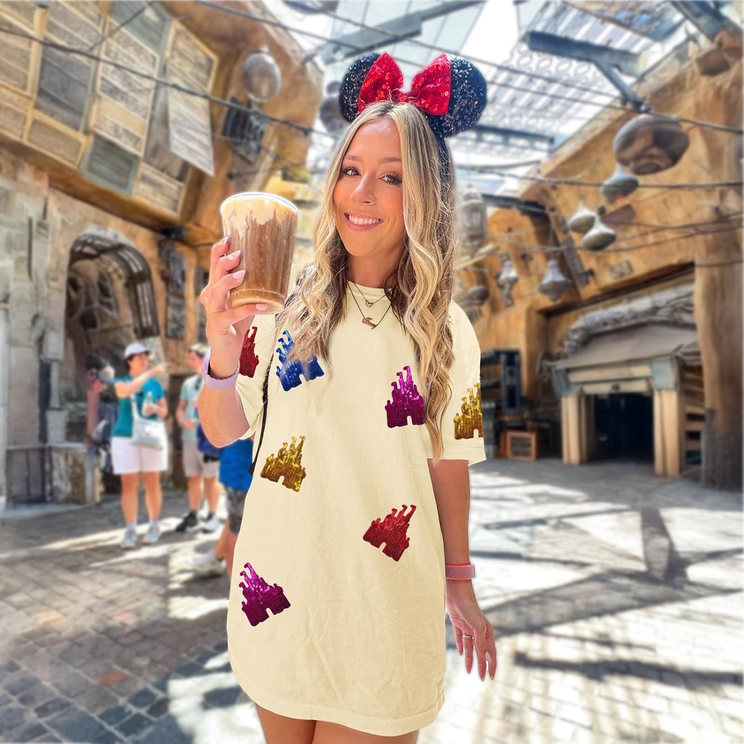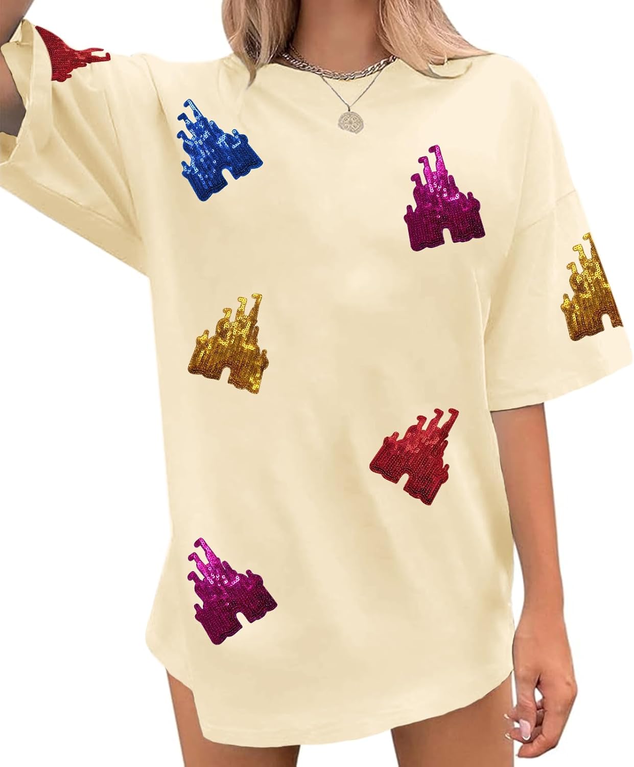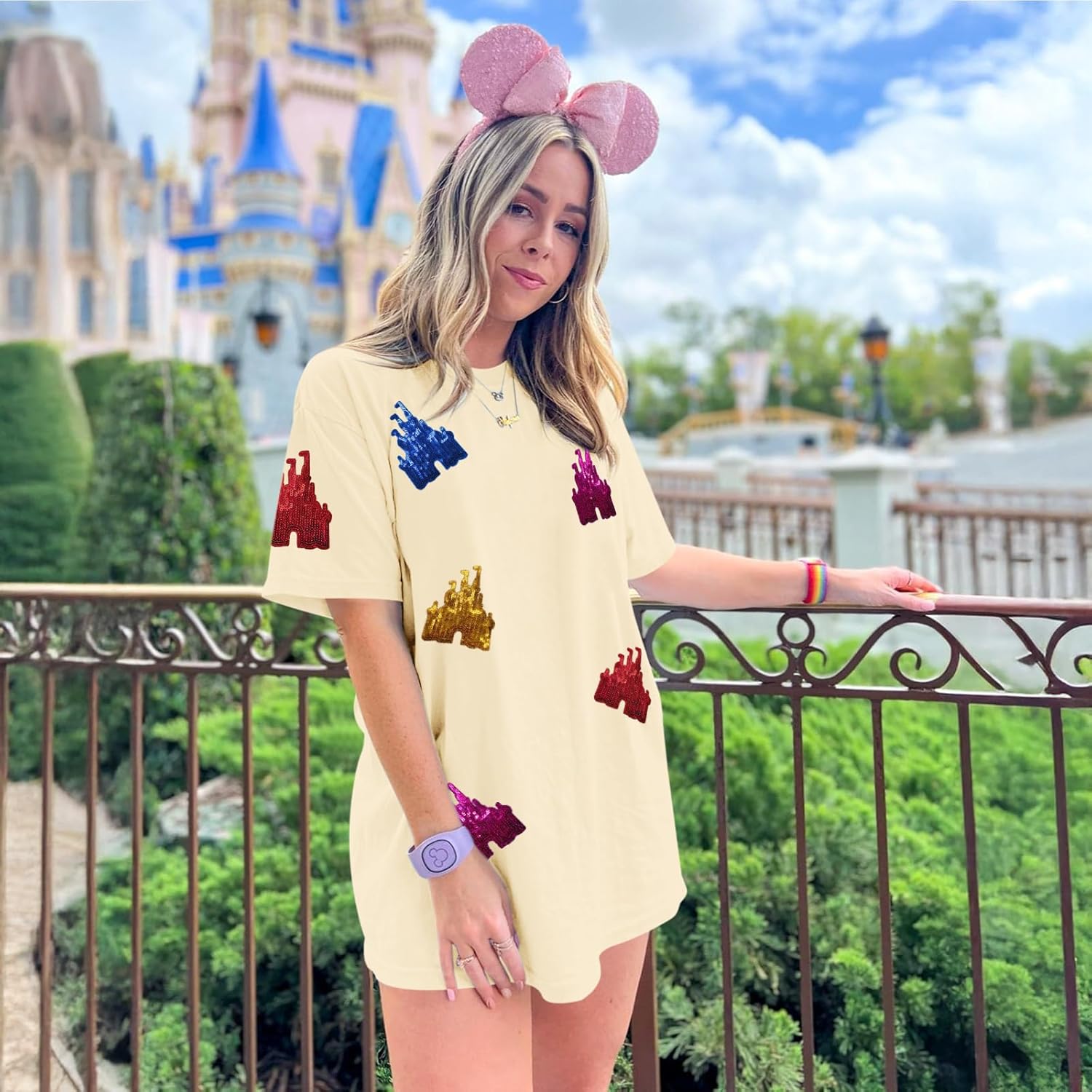 Bobeutou Magic Kingdom Shirts for Women Sequin Colorful Magical Castle Graphic Shirt Holiday Vacation Tshirt Funny Tee Tops