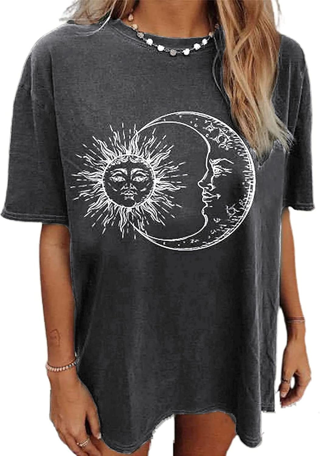 Remidoo Women's Casual Oversized T Shirt Short Sleeve Graphic Tee Letter Sun Moon Shirts quantity
