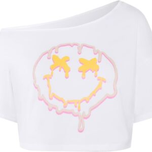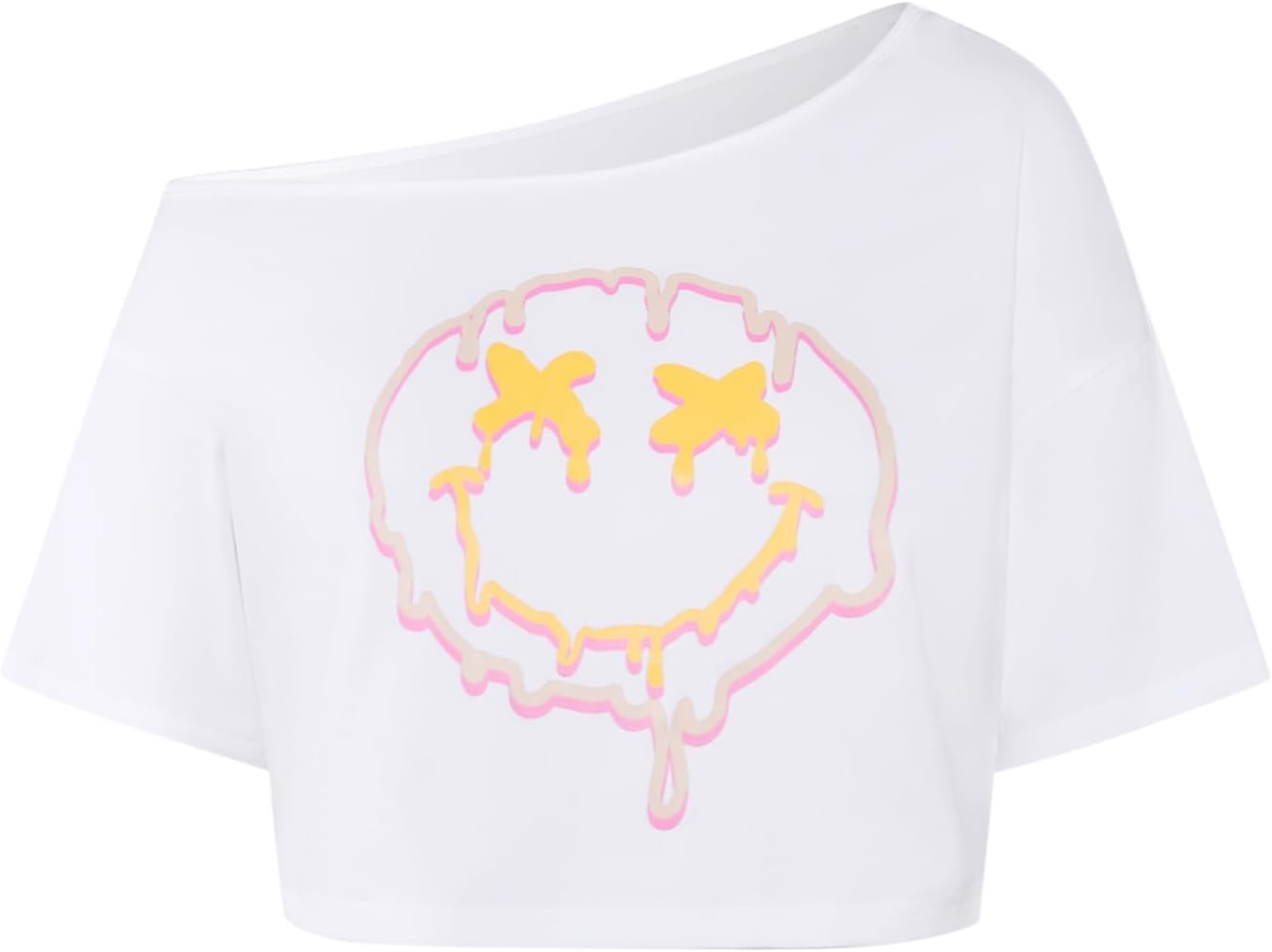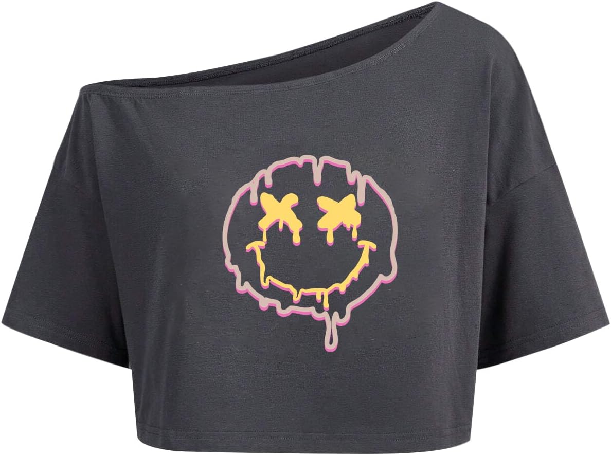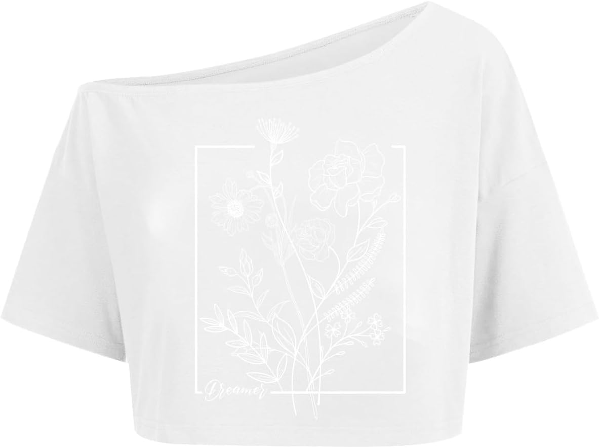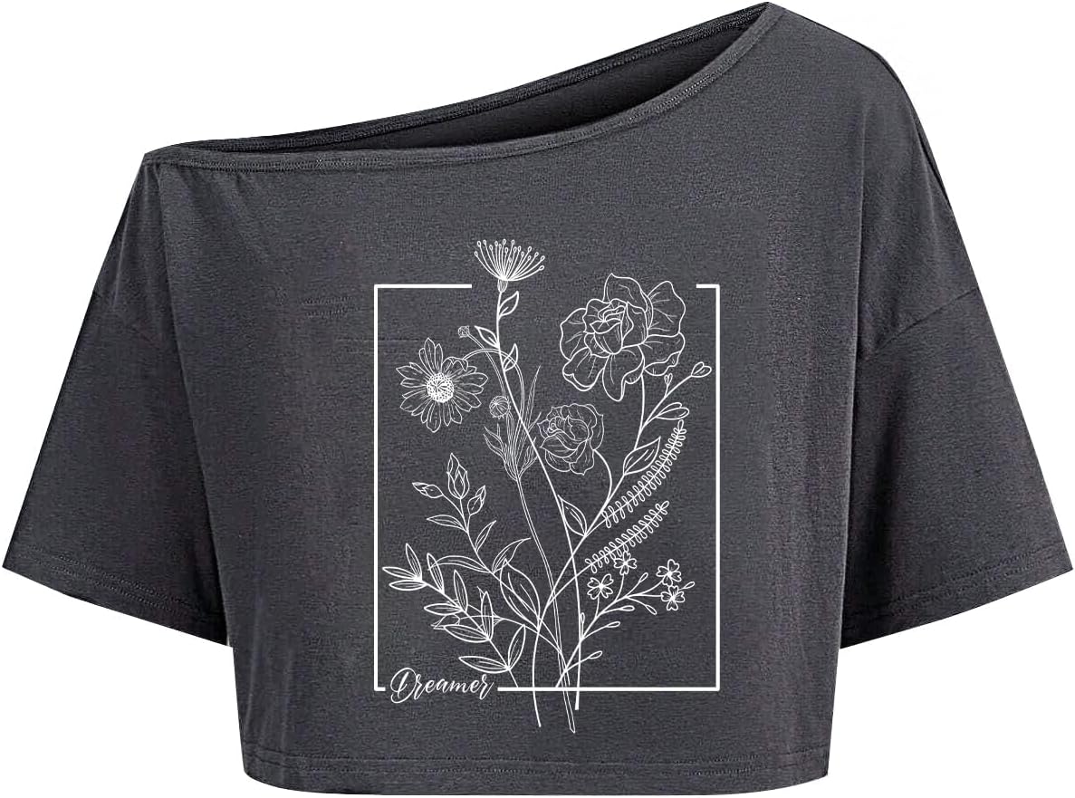 Remidoo Women Graphic Tee Off The Shoulder Crop Top Short Sleeve Loose Tops