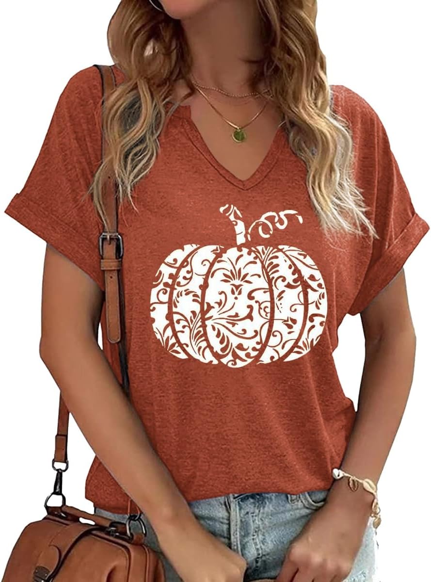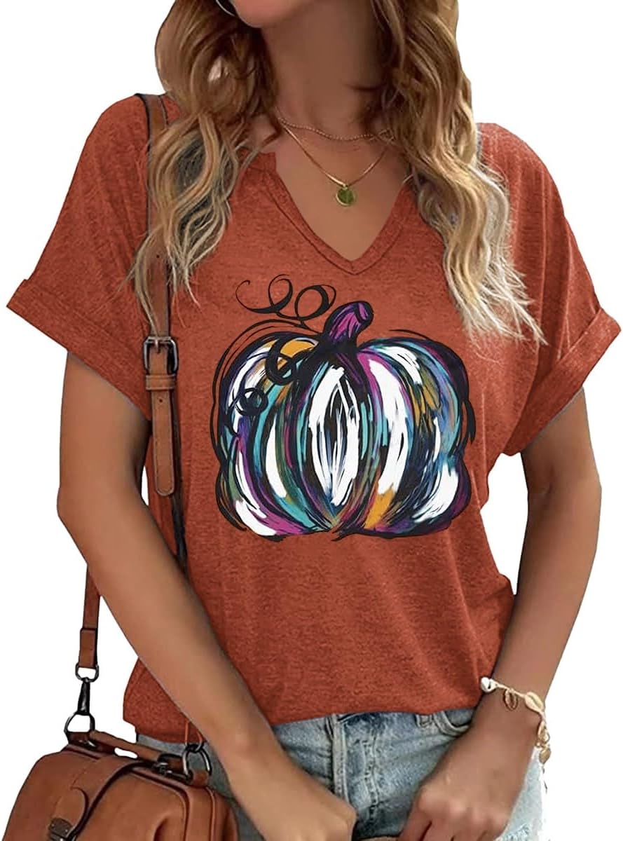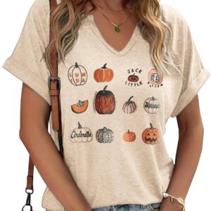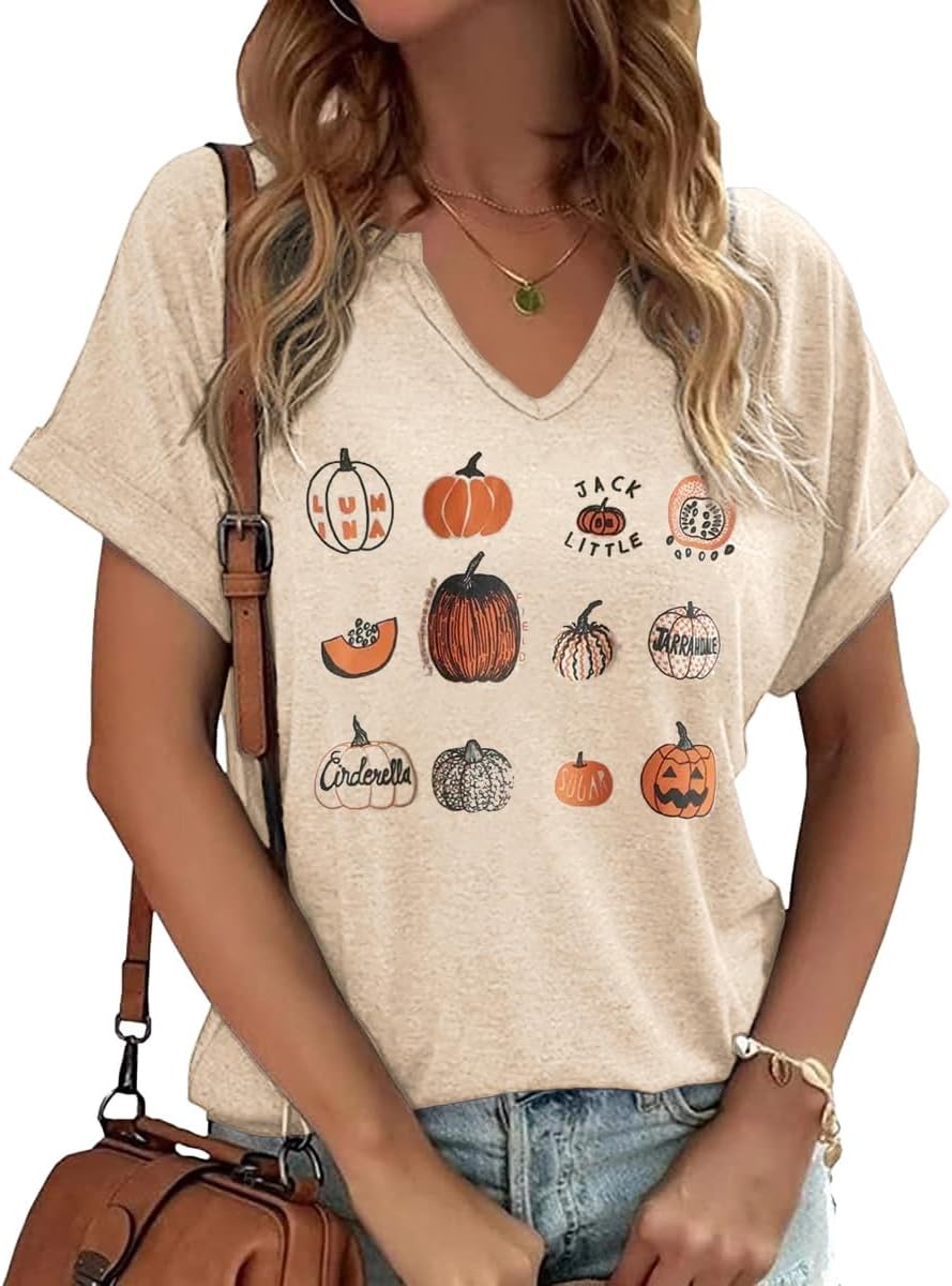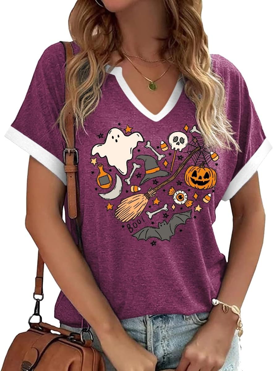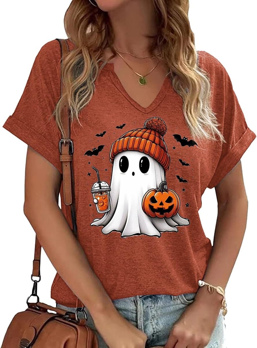 Women Fall Halloween Doodles V Neck Shirt Funny Family Party Celebration Short Sleeve Tee