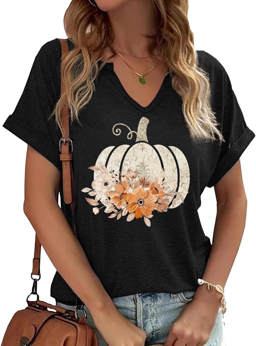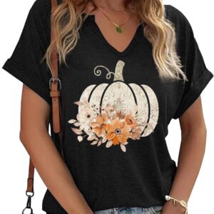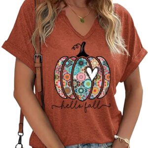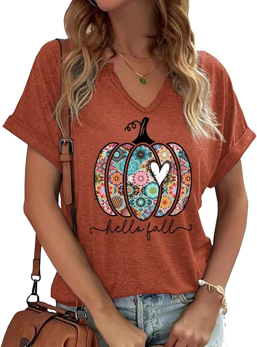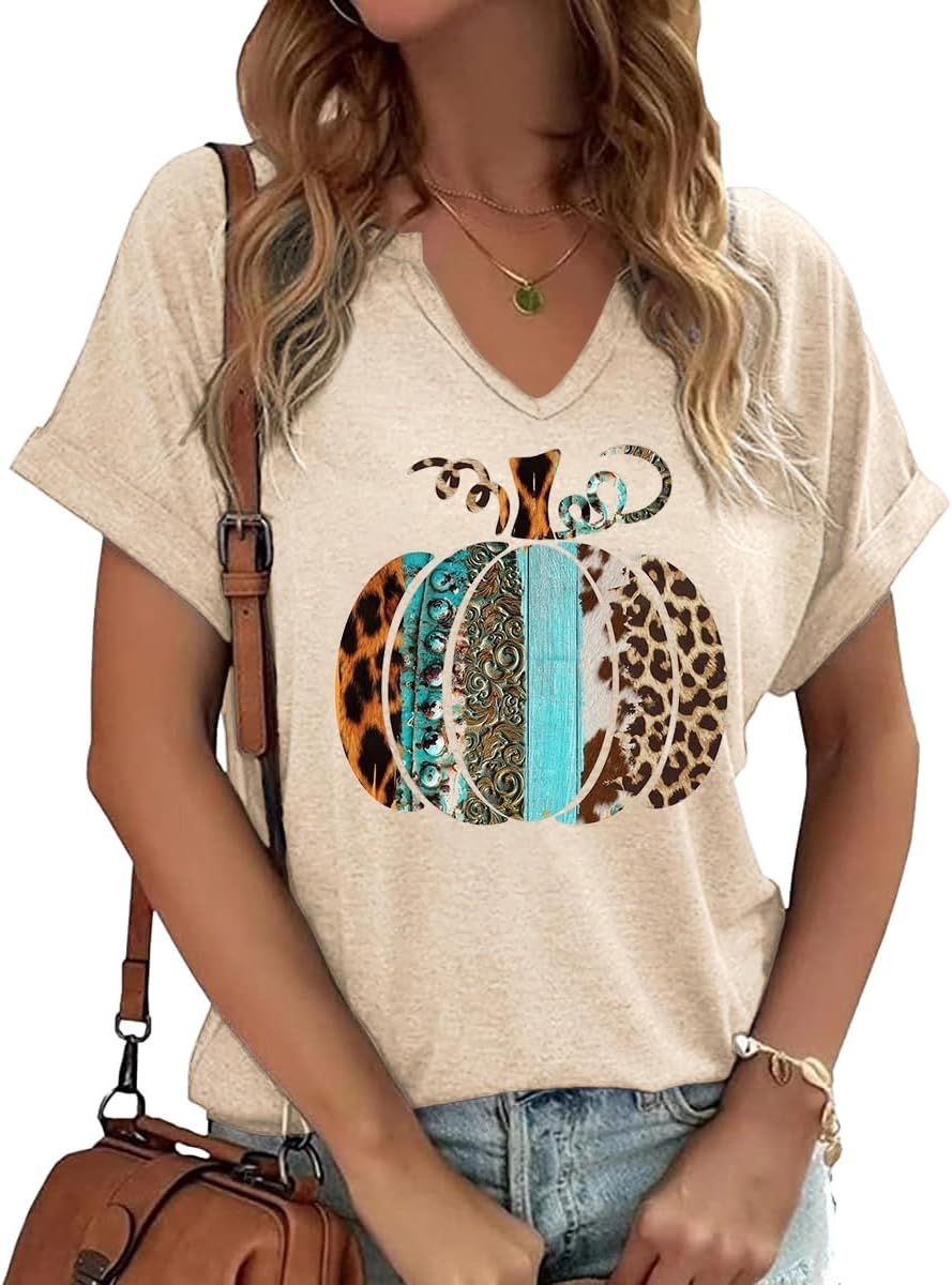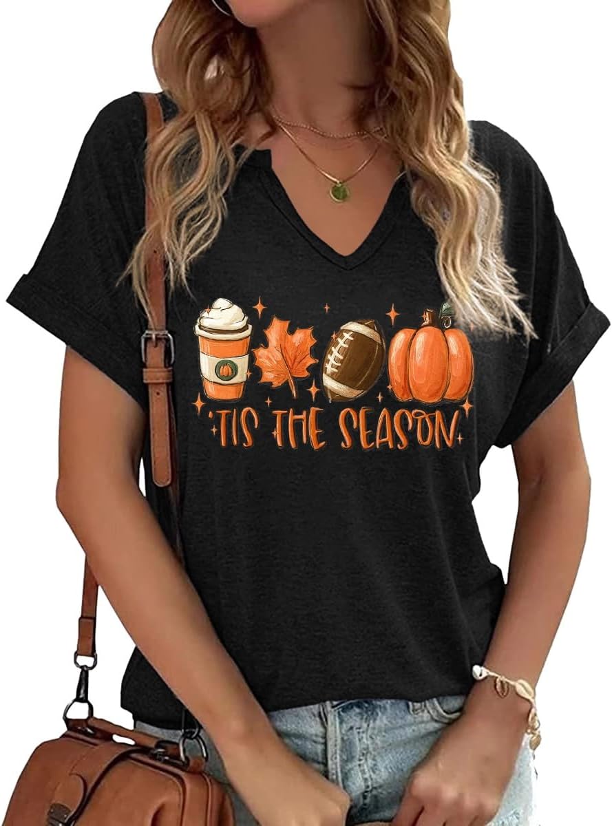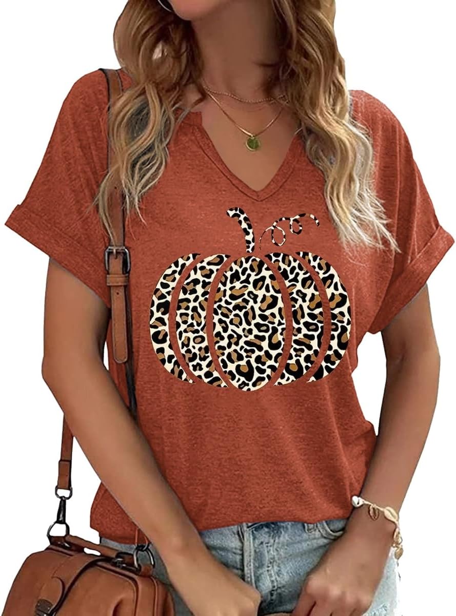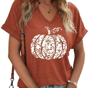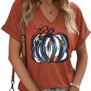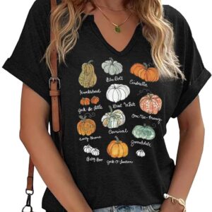 Women Fall Halloween Doodles V Neck Shirt Funny Family Party Celebration Short Sleeve Tee