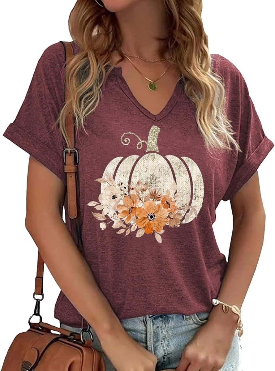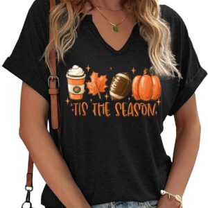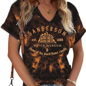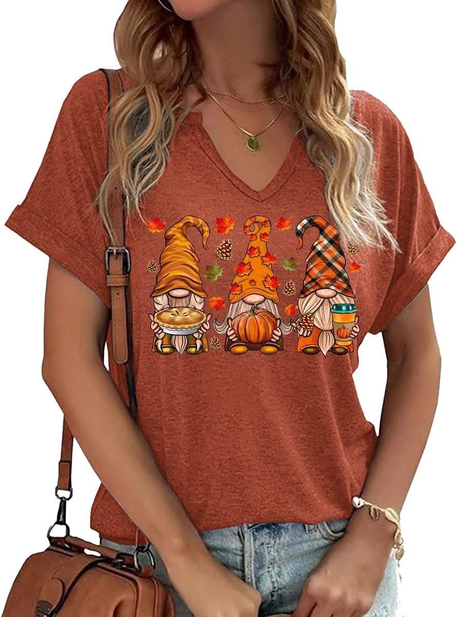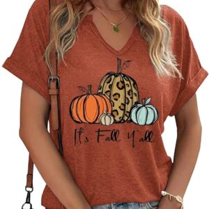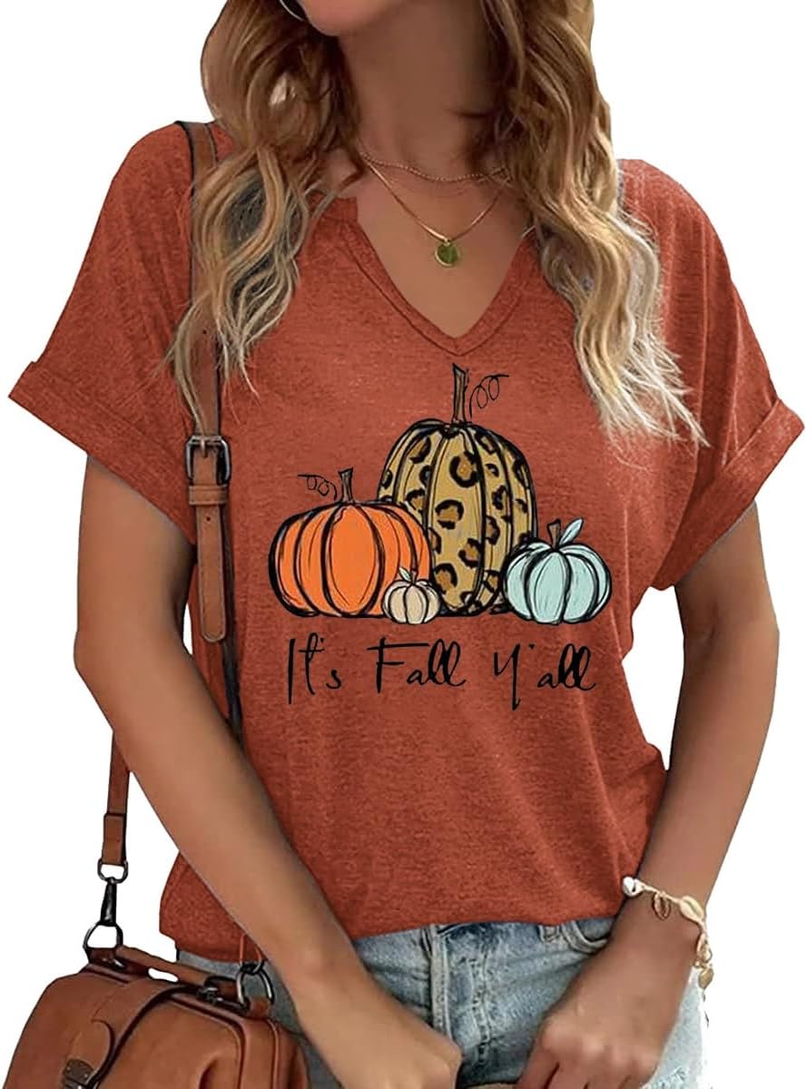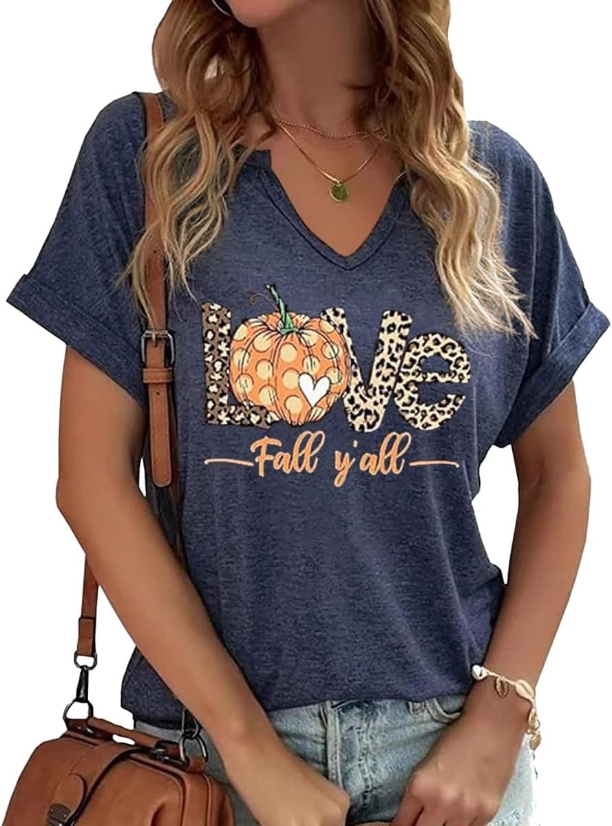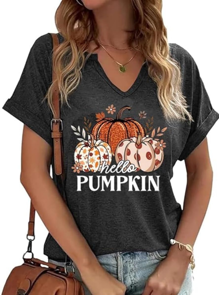 Women Fall Halloween Doodles V Neck Shirt Funny Family Party Celebration Short Sleeve Tee