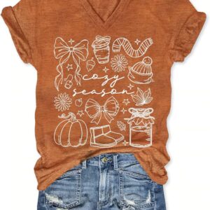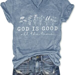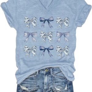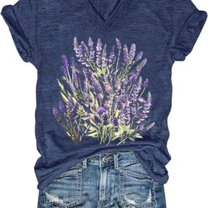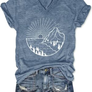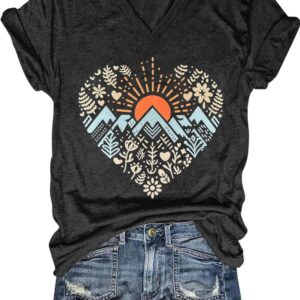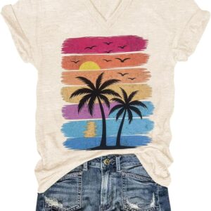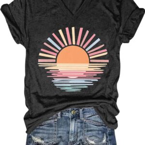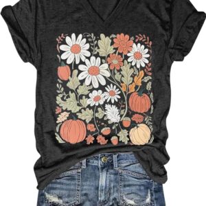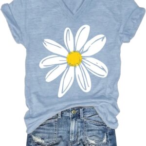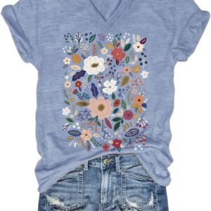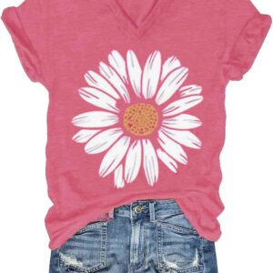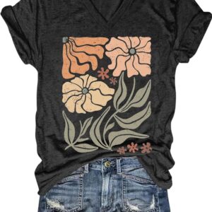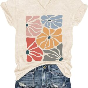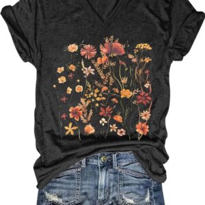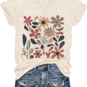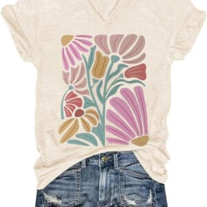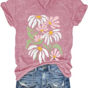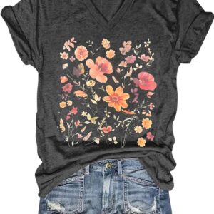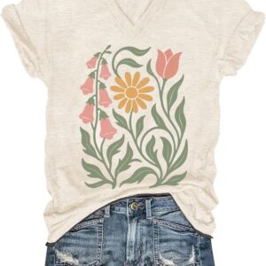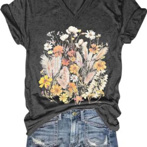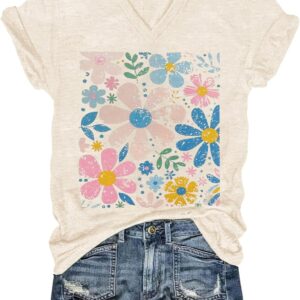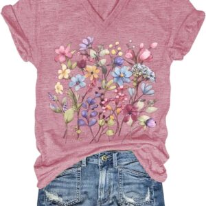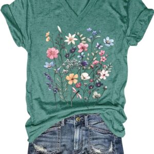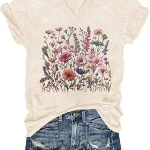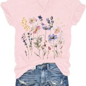 Womens V-Neck T-Shirt Flower Graphic Tees Summer Fashion Boho Tops Tshirts Loose Casual Wildflower Beach T Shirts
