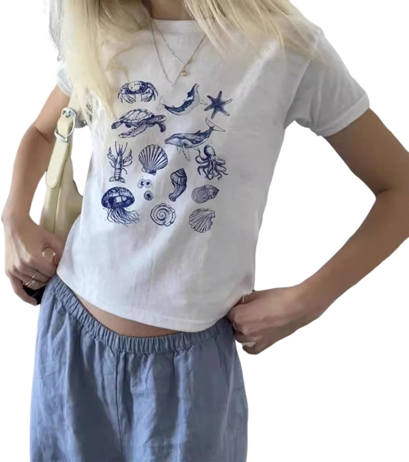 Y2k Graphic Baby Tees Women Teen Girl Fruit Print Crop Top Short Sleeve Slim Fit Vintage Aesthetic T Shirt Clothes